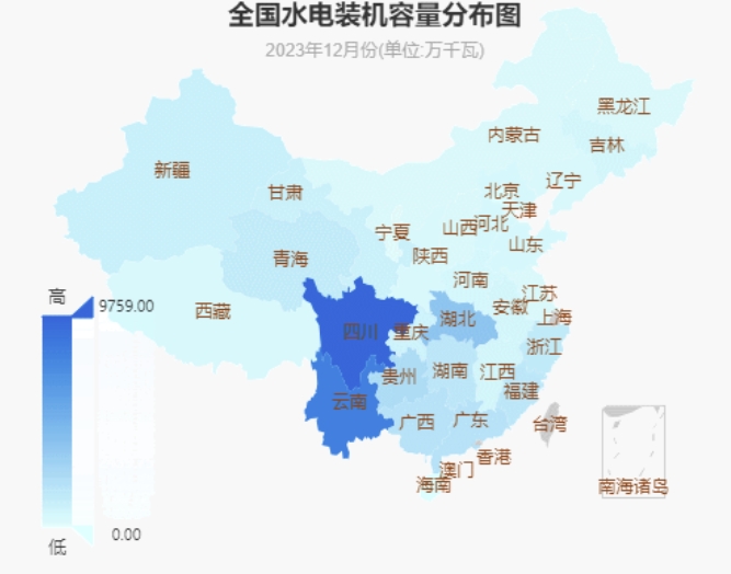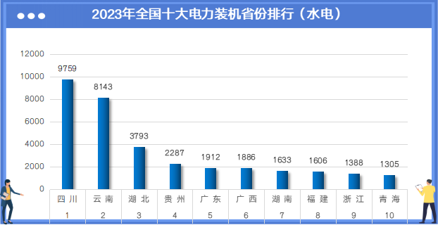 截至2023年12月底,全国十大水电装机省份分别是:四川9759万千瓦、云南8143万千瓦、湖北3793万千瓦、贵州2287万千瓦、广东1912万千瓦、广西1886万千瓦、湖南1633万千瓦、福建1606万千瓦、浙江1388万千瓦、青海1305万千瓦。
