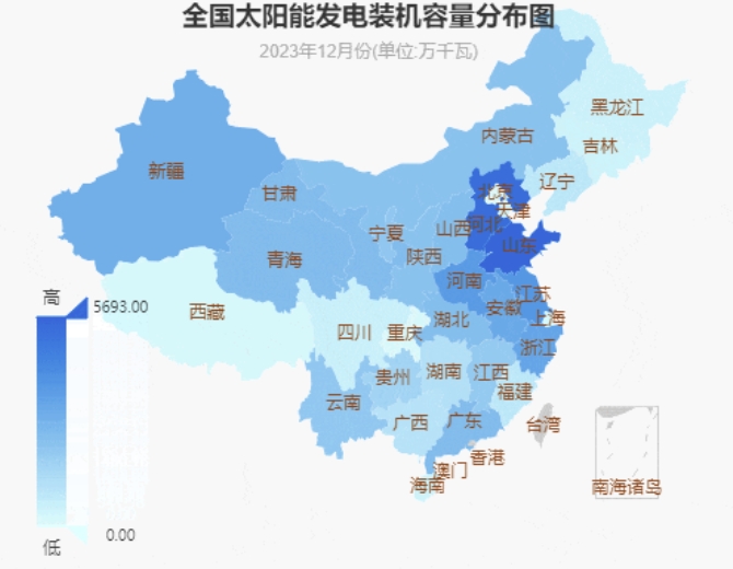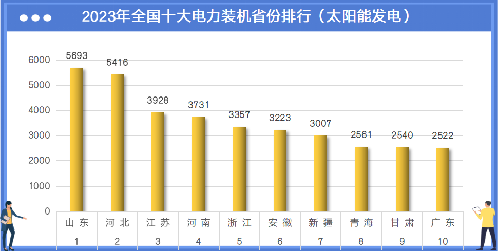 截至2023年12月底,全国十大太阳能发电装机省份分别是:山东5693万千瓦、河北5416万千瓦、江苏3928万千瓦、河南3731万千瓦、浙江3357万千瓦、安徽3223万千瓦、新疆3007万千瓦、青海2561万千瓦、甘肃2540万千瓦、广东2522万千瓦。