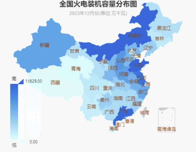 截至2023年12月底,全国十大火电装机省份分别是:内蒙古11829万千瓦、山东11798万千瓦、广东11629万千瓦、江苏10748万千瓦、山西8011万千瓦、河南7402万千瓦、新疆7199万千瓦、浙江6794万千瓦、安徽6071万千瓦、陕西5676万千瓦。