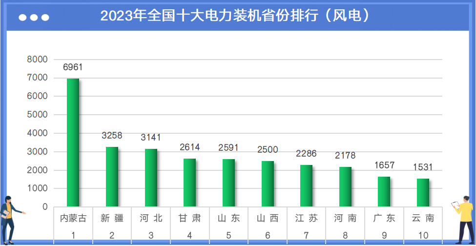 截至2023年12月底,全国十大风电装机省份分别是:内蒙古6961万千瓦、新疆3258万千瓦、河北3141万千瓦、甘肃2614万千瓦、山东2591万千瓦、山西2500万千瓦、江苏2286万千瓦、河南2178万千瓦、广东1657万千瓦、云南1531万千瓦。